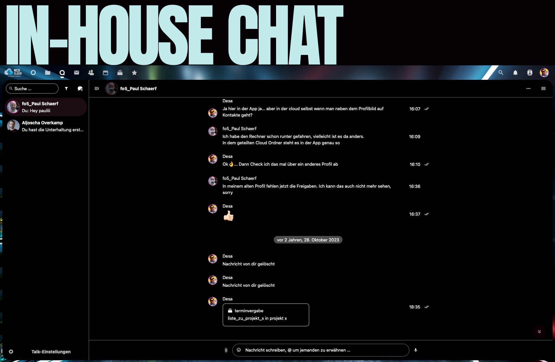 Absprachen bleiben im Kontext von Aufgaben, Dateien und Boards – ohne Umwege über externe Messenger und ohne Informationsverlust.